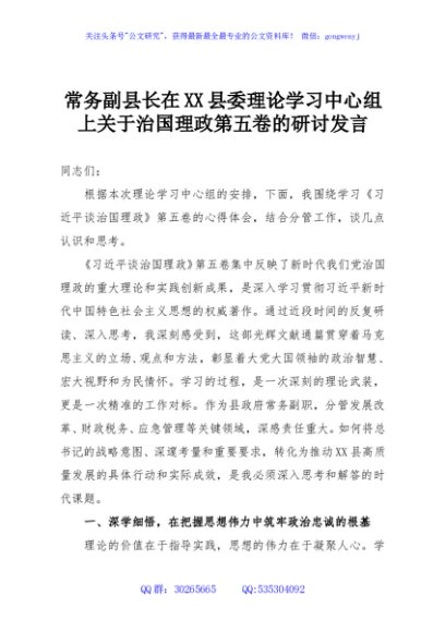 / 常务副县长在XX县委理论学习中心组上关于治国理政第五卷的研讨发言
