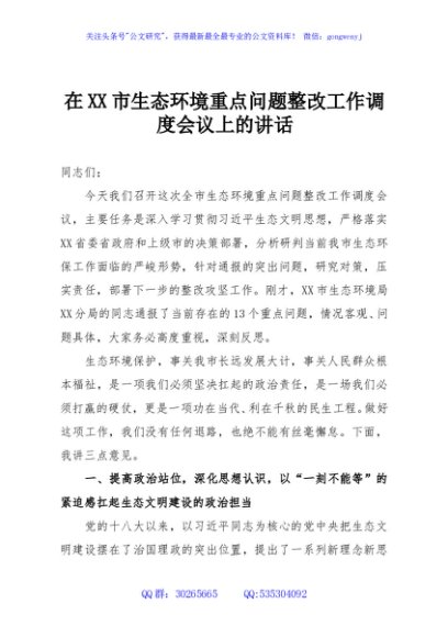 / 在XX市生态环境重点问题整改工作调度会议上的讲话