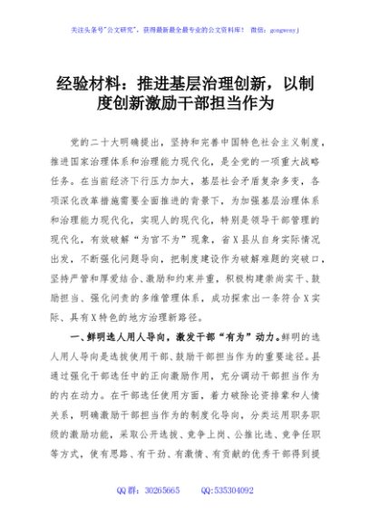 / 经验材料:推进基层治理创新,以制度创新激励干部担当作为