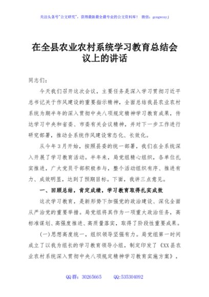 / 在全县农业农村系统学习教育总结会议上的讲话