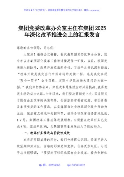 / 集团党委改革办公室主任在集团2025年深化改革推进会上的汇报发言