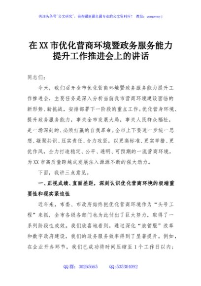 / 在XX市优化营商环境暨政务服务能力提升工作推进会上的讲话