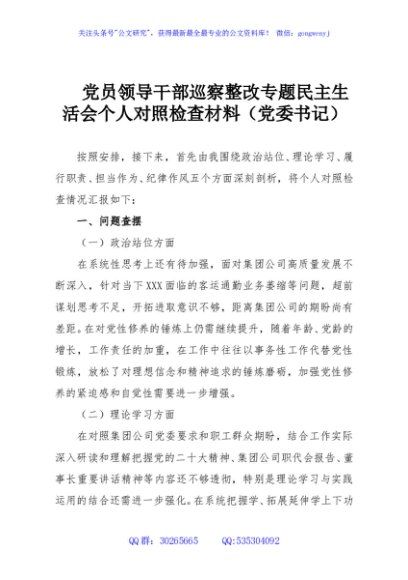 / 党员领导干部巡察整改专题民主生活会个人对照检查材料(党委书记)