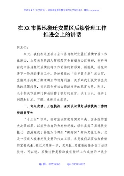 / 在XX市易地搬迁安置区后续管理工作推进会上的讲话