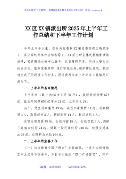 / XX区XX镇派出所2025年上半年工作总结和下半年工作计划