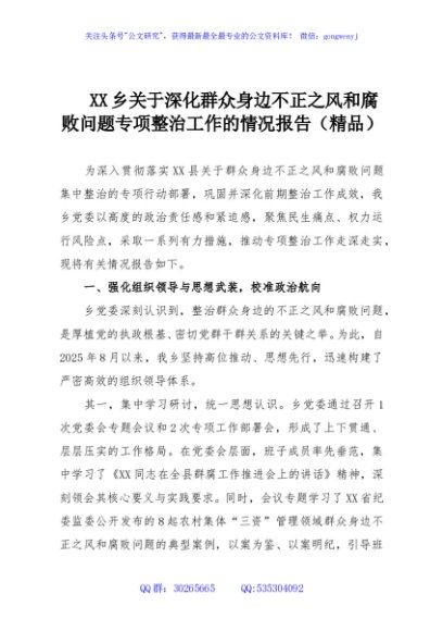 / XX乡关于深化群众身边不正之风和腐败问题专项整治工作的情况报告(精品)