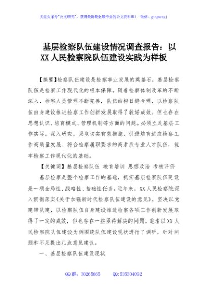 / 基层检察队伍建设情况调查报告:以XX人民检察院队伍建设实践为样板