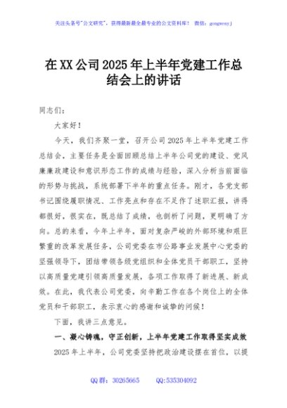 / 在XX公司2025年上半年党建工作总结会上的讲话