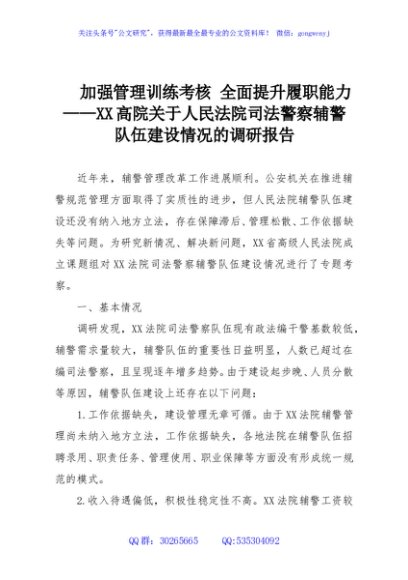 / 加强管理训练考核 全面提升履职能力——XX高院关于人民法院司法警察辅警队伍建设情况的调研报告