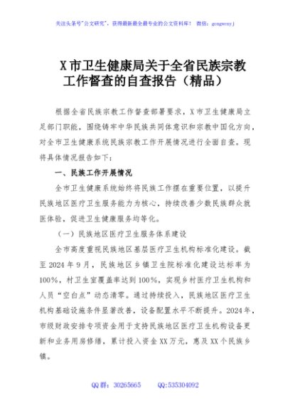 / X市卫生健康局关于全省民族宗教工作督查的自查报告(精品)