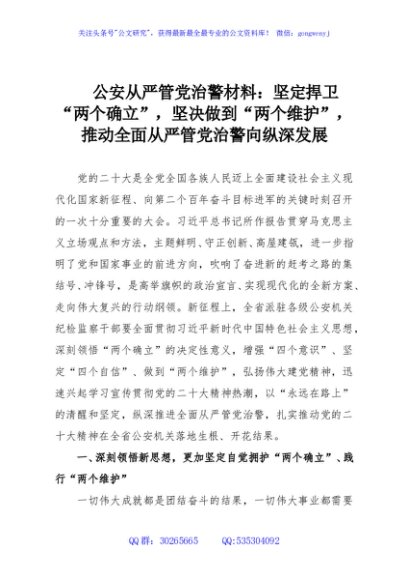 / 公安从严管党治警材料:坚定捍卫“两个确立”,坚决做到“两个维护”,推动全面从严管党治警向纵深发展