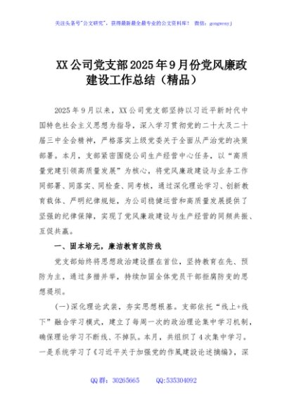 XX公司党支部2025年9月份党风廉政建设工作总结(精品)