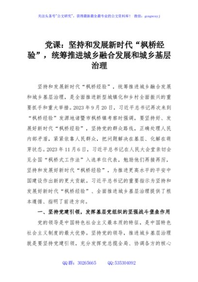 / 党课:坚持和发展新时代“枫桥经验”,统筹推进城乡融合发展和城乡基层治理