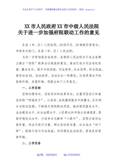 / XX市人民政府XX市中级人民法院关于进一步加强府院联动工作的意见