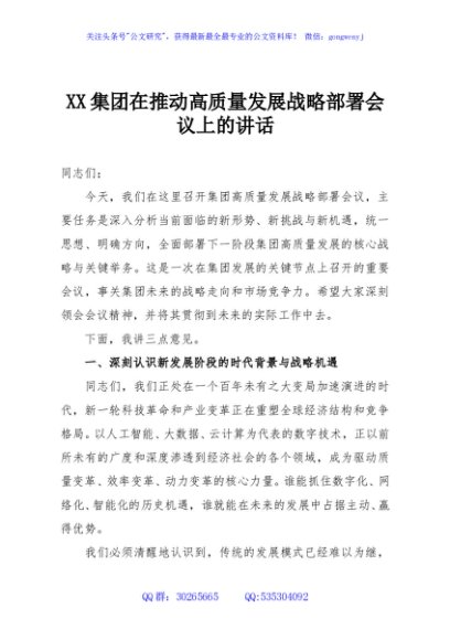 / XX集团在推动高质量发展战略部署会议上的讲话