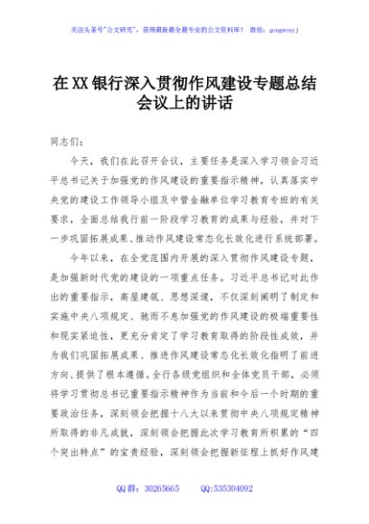 / 在XX银行深入贯彻作风建设专题总结会议上的讲话
