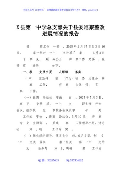/ X县第一中学总支部关于县委巡察整改进展情况的报告
