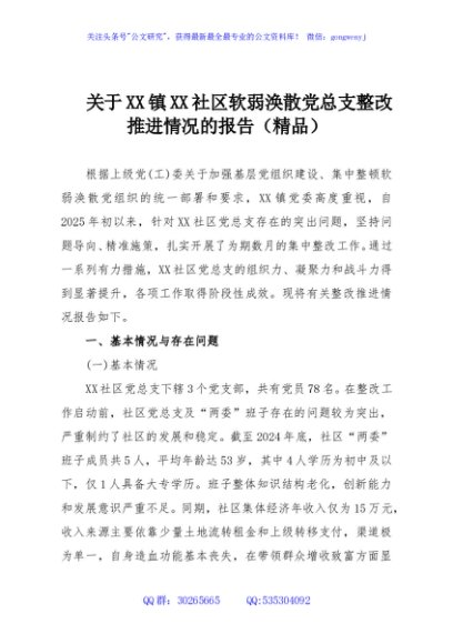/ 关于XX镇XX社区软弱涣散党总支整改推进情况的报告(精品)