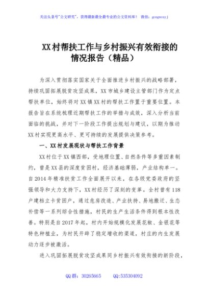 / XX村帮扶工作与乡村振兴有效衔接的情况报告(精品)