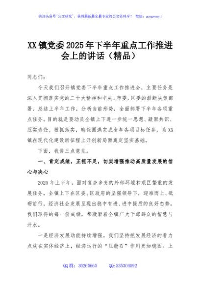 / XX镇党委2025年下半年重点工作推进会上的讲话(精品)