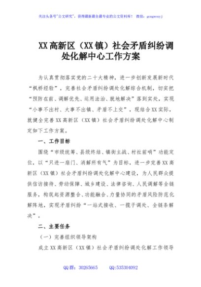 / XX高新区(XX镇)社会矛盾纠纷调处化解中心工作方案