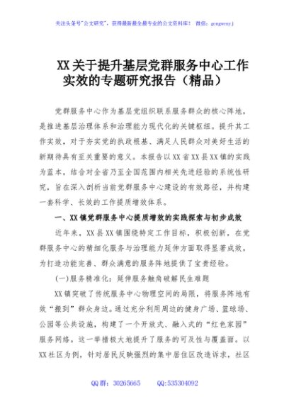 / XX关于提升基层党群服务中心工作实效的专题研究报告(精品)