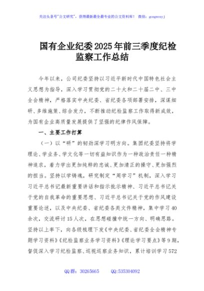 / 国有企业纪委2025年前三季度纪检监察工作总结