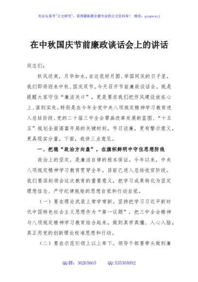 / 在中秋国庆节前廉政谈话会上的讲话
