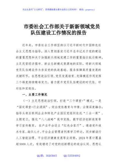 / 市委社会工作部关于新新领域党员队伍建设工作情况的报告