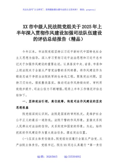 / XX市中级人民法院党组关于2025年上半年深入贯彻作风建设加强司法队伍建设的评估总结报告(精品)
