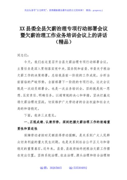 / XX县委全县欠薪治理专项行动部署会议暨欠薪治理工作业务培训会议上的讲话(精品)