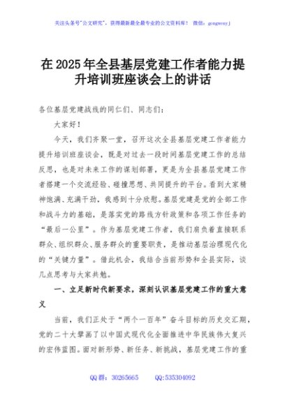 / 在2025年全县基层党建工作者能力提升培训班座谈会上的讲话