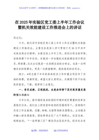 / 在2025年实验区党工委上半年工作会议暨机关效能建设工作推进会上的讲话