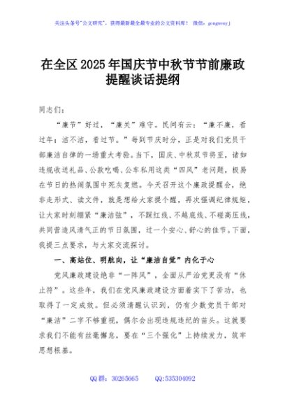 / 在全区2025年国庆节中秋节节前廉政提醒谈话提纲