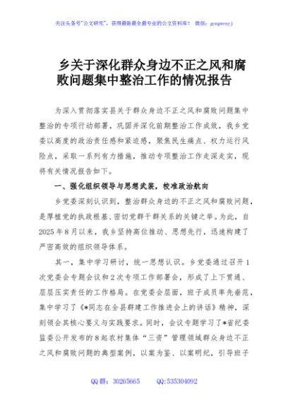 乡关于深化群众身边不正之风和腐败问题集中整治工作的情况报告