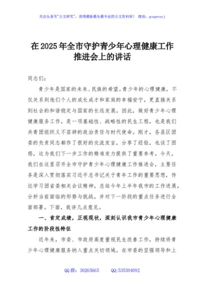 / 在2025年全市守护青少年心理健康工作推进会上的讲话