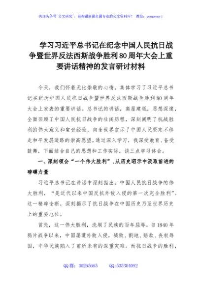 / 学习习近平总书记在纪念中国人民抗日战争暨世界反法西斯战争胜利80周年大会上重要讲话精神的发言研讨材料