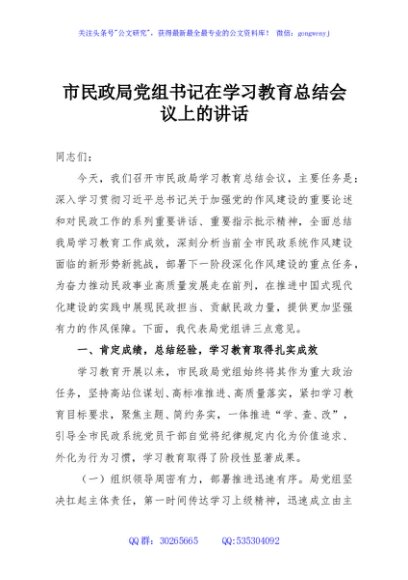 / 市民政局党组书记在学习教育总结会议上的讲话
