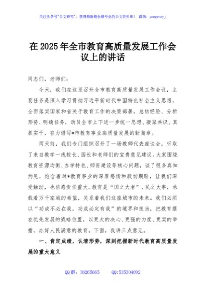 / 在2025年全市教育高质量发展工作会议上的讲话