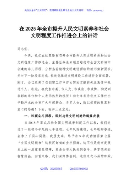 / 在2025年全市提升人民文明素养和社会文明程度工作推进会上的讲话
