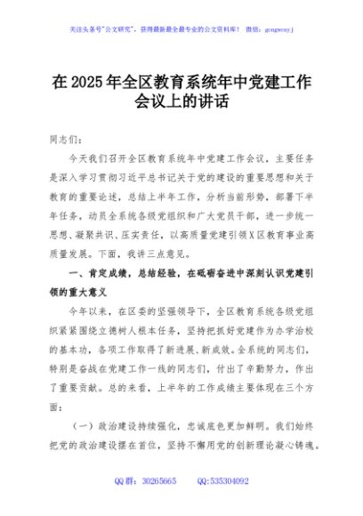 / 在2025年全区教育系统年中党建工作会议上的讲话