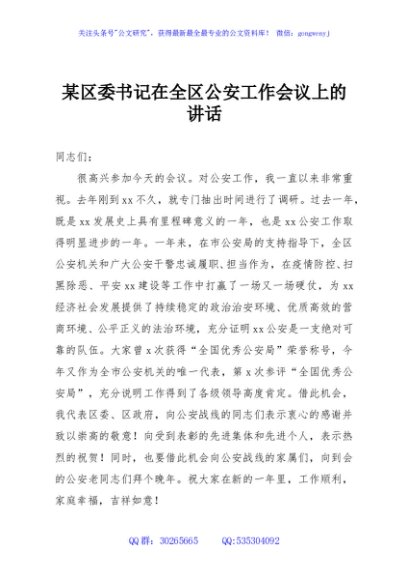 / 某区委书记在全区公安工作会议上的讲话