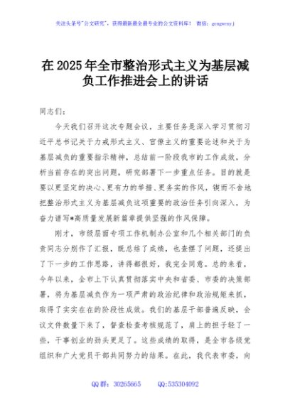 / 在2025年全市整治形式主义为基层减负工作推进会上的讲话