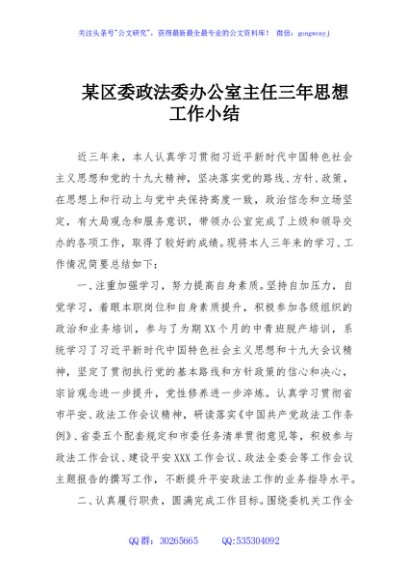 / 某区委政法委办公室主任三年思想工作小结