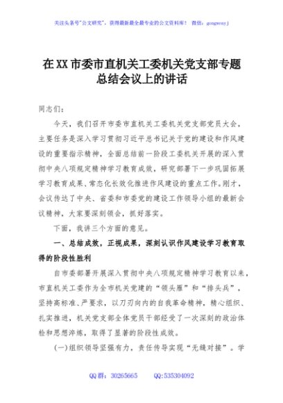 / 在XX市委市直机关工委机关党支部专题总结会议上的讲话