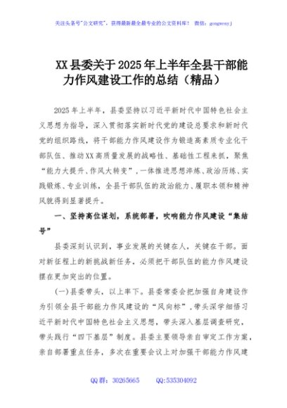 / XX县委关于2025年上半年全县干部能力作风建设工作的总结(精品)