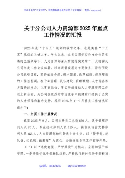 / 关于分公司人力资源部2025年重点工作情况的汇报