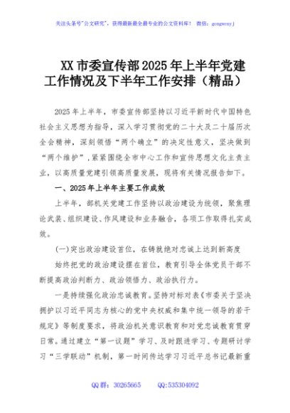 / XX市委宣传部2025年上半年党建工作情况及下半年工作安排(精品)
