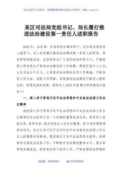 / 某区司法局党组书记、局长履行推进法治建设第一责任人述职报告