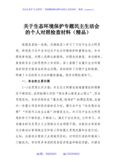 / 关于生态环境保护专题民主生活会的个人对照检查材料(精品)